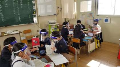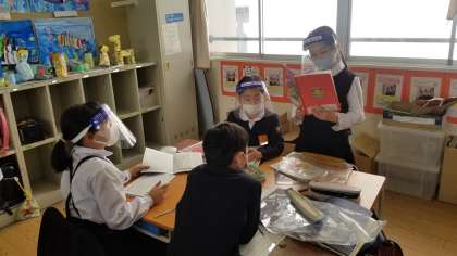 3年2組の国語の様子です。本の紹介をします。まず、近くのグループで紹介しあっていました。
