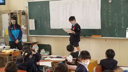 1年1組の国語の様子です。単元は「こどもをまもるどうぶつたち」です。動物の知恵や生活について調べたことをまとめて発表していました。