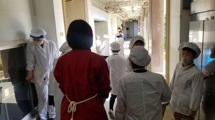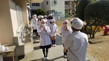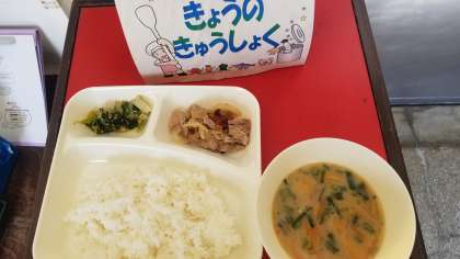 今日の給食は、豚肉のしょうが焼き、さつまいものみそ汁、きくなとはくさいのごまあえ、ごはん、牛乳です。いただきます。
