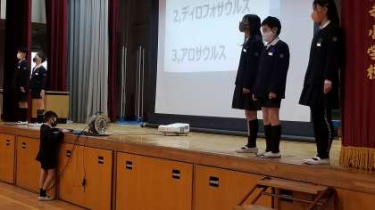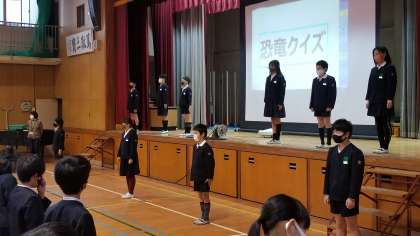 先週に続き、4・5・6年生が児童集会を行いました。先週と同じ、「恐竜」と「ここはどこでしょう」のクイズです。