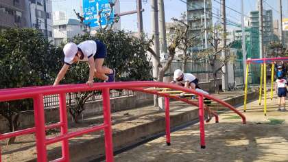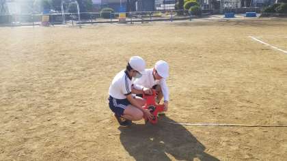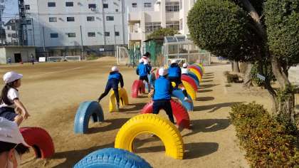 3年2組の体育の様子です。走の運動の小型ハードル走の授業です。ハードル走の前に準備運動として、運動場の固定遊具をサーキットで回ります。