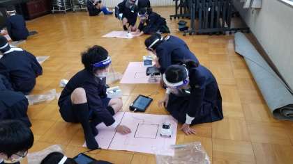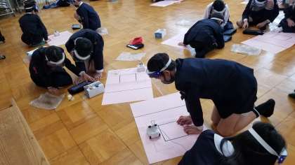 6年2組のプログラミング学習の様子です。画用紙に描かれた矢印のとおり、ロボットを動かしています。