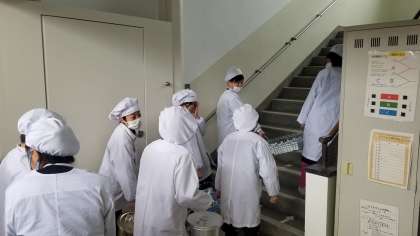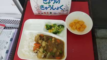 今日の給食は、冬野菜のカレーライス、ブロッコリーとコーンのサラダ、黄桃(缶)、牛乳です。いただきます。