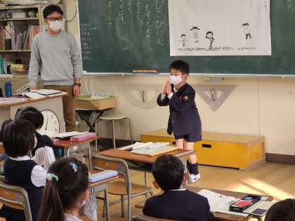 写真下:1年2組の国語の様子です。みみずのたいそうという詩を、工夫して読んでいました。発表では、体全体を使って表現していました。