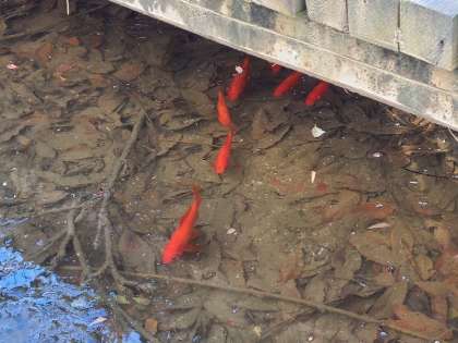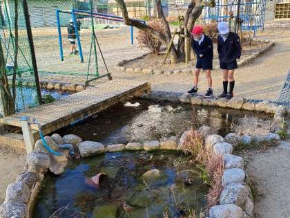 今年一番の冷え込みで、ザリガニ池に氷が張りました。子どもたちは、「わぁ、氷が張ってる。」「氷の下で金魚がゆっくり動いてる。」と、しっかり観察していました。