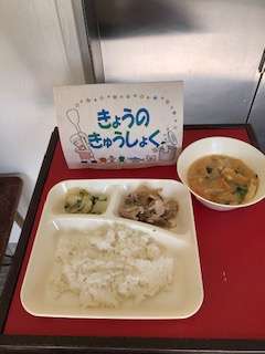 今日の献立は、豚肉のゴマダレ焼き、みそ汁、きくなと白菜のおひたし、ご飯、牛乳です。とてもおいしかったです。