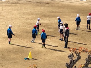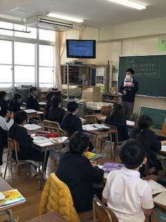 中段は、3年生の理科。音が伝わるときの学習をしていました。鼓面に小さい球を置いて、たたいた時の動き具合で音の振動が見えるようにしていました。