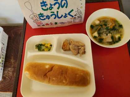 今日の給食は、鶏肉のオイスターソース焼き、中華スープ、チンゲンサイをコーンの中華あえ、パン、牛乳です。いただきます。