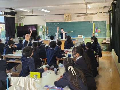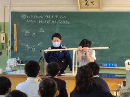 6年1組の理科の様子です。てこの働きについて学習しています。力点の位置を変え、手ごたえのちがいを実際に感じていました。