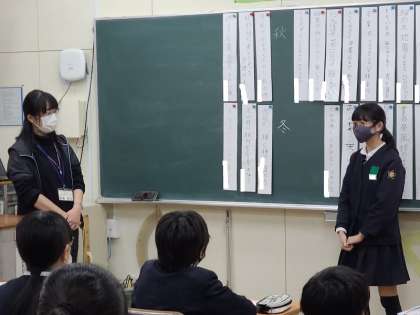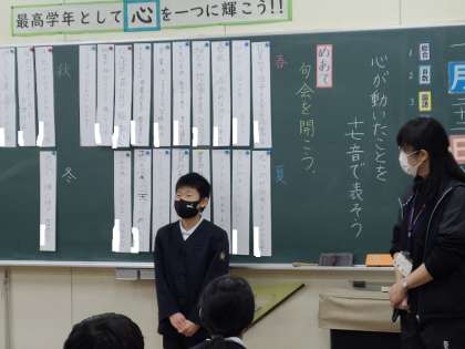 6年1組の国語の様子です。「心が動いたことを17音で表そう」と句会を開いていました。5・7・5という言葉のリズムを通して感動や心情を効果的に伝える俳句は、日本の言語文化に欠かせないものです。子どもたちは、作品が自分の気持ちにあう言葉か吟味しながら発表していました。とても素晴らしかったです。17音に無限の広がりを感じました。