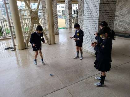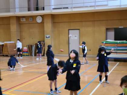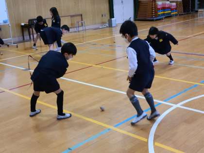 2年生のお正月伝承遊びの様子です。日常生活の中で見ることがほとんどなくなってきた昔の遊びです。伝統的な遊びや昔遊びのおもしろさを知り、みんなと協力して遊ぶことを目的としています。