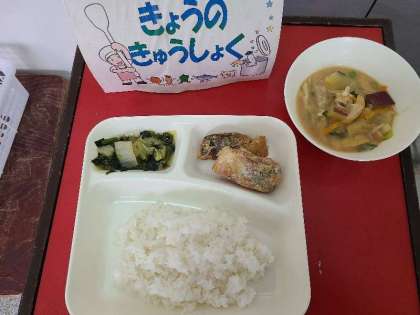 今日の給食は、さばのカレーたつたあげ、さつまいもとうすあげのみそ汁、はくさいとほうれんそうの煮びたし、ごはん、牛乳です。いただきます。