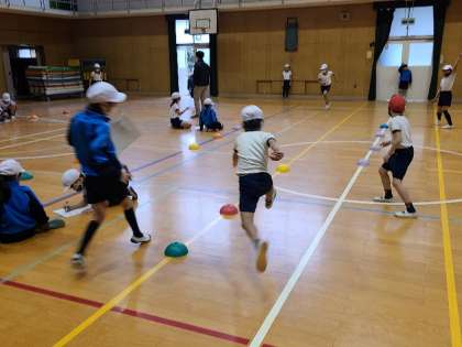 3年2組の体育の様子です。雨で運動場が使えないので、体育館で幅跳びの踏切の練習をしていました。