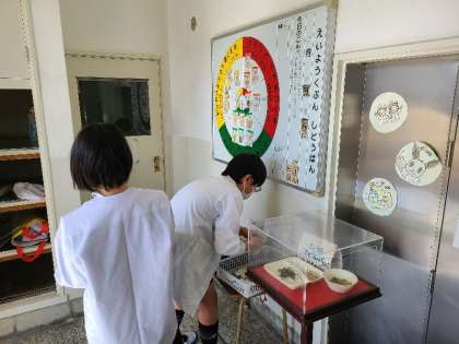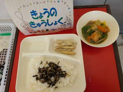今日の給食は、いわしてんぷら、あつあげと野菜の煮もの、ぼまひじき、ごはん、牛乳です。いただきます。