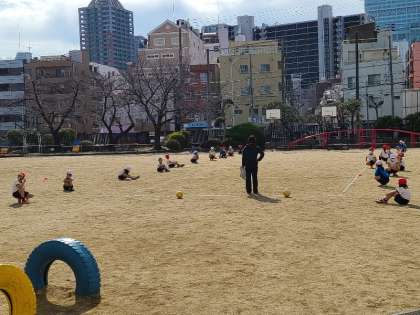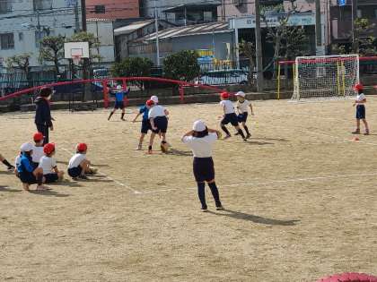 2年1組の体育の様子です。ボールゲームの授業です。攻守に分かれ、簡単なルールのもとでボールを操作してゲームを行います。しっかりと先生のお話を聞いてゲームをすることができていました。