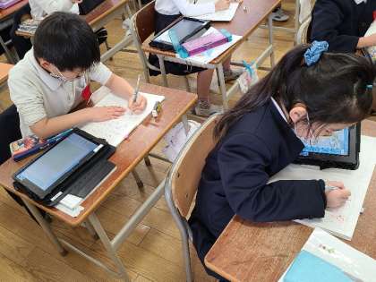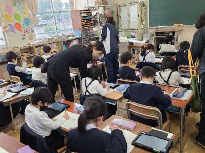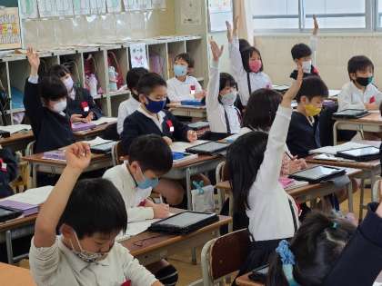 本日5時間目、1年1組が国語の授業研究を行いました。単元は「まとめてよぶことば」です。言葉には意味による語句のまとまりがあることに気づき、「、」や「。」に注意しながら文を作りました。友だちが集めた語句は、タブレットの発表ノートを活用して全体で考えました。