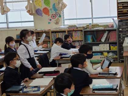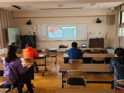 今回の授業研究は密を避けるため、オンラインで多目的室でも参観ができるように行いました。