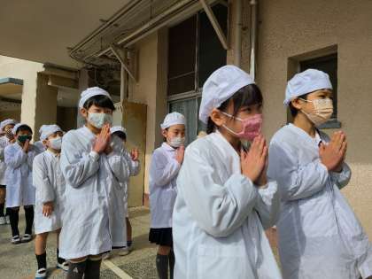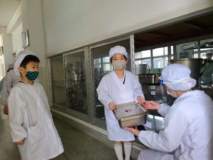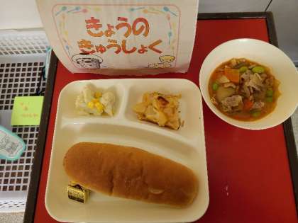 今日の給食は、豚肉と野菜のケチャップ煮、カリフラワーのピクルス、桃のクラフティ、パン、牛乳です。いただきます。