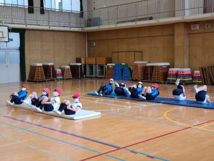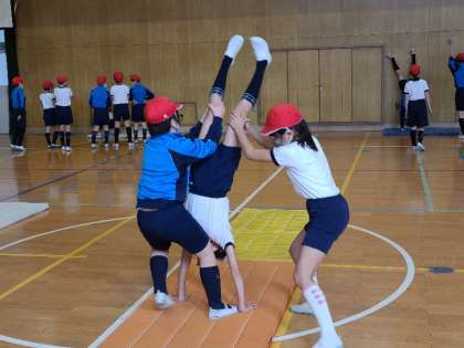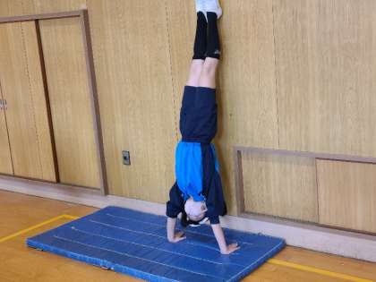 4年1組の体育の様子です。マット運動の様子です。皆でゴロンと準備運動の後、補助倒立、壁倒立に取り組んでいました。体操選手のような見事な倒立です。