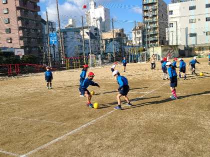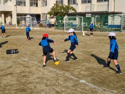 2年2組の体育の様子です。攻守が入り交じったボール蹴りゲームです。ボール操作がとても上手になりました。