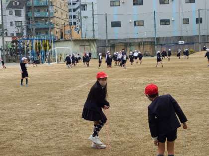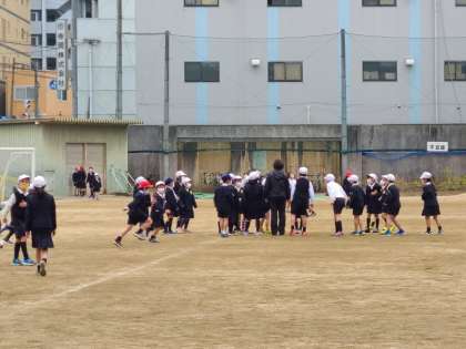今日は7時間授業の日で、休み時間に運動場でいっぱい遊べるのはお昼休みです。学級皆で遊ぶ姿もありました。