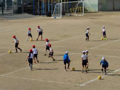 下:2年1組の体育の様子です。運動場を広く使って、ボールゲームの運動をしていました。