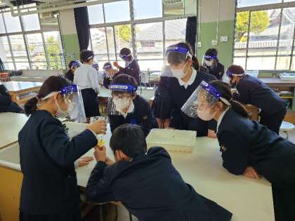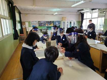 5年1組の理科の様子です。もののとけ方について実験しています。水に溶かしたミョウバンについて、水の量を変えるとミョウバンの量はどうなるのか実験していました。