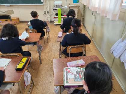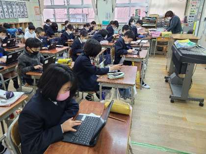 朝学習の様子です。5年生は一人一台の新しいタブレットで、キーボードの練習をしています。2年生は読書活動をしていました。