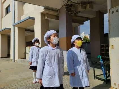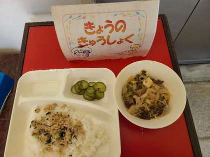 今日の給食は、近江牛のすき焼き煮、きゅうりのゆずの香あえ、ツナっ葉いため、ごはん、牛乳です。いただきます。