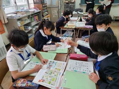 5年1組の英語の様子です。英語で道案内をする学習です。道案内ができるように、自分たちの町をの図を作成して準備をしていました。