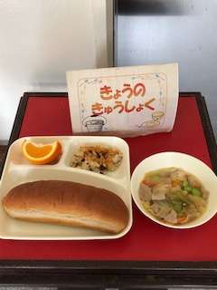 今日の献立は、おしむぎのグラタン、スープ、いよかん、黒糖パン、牛乳でした。