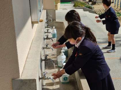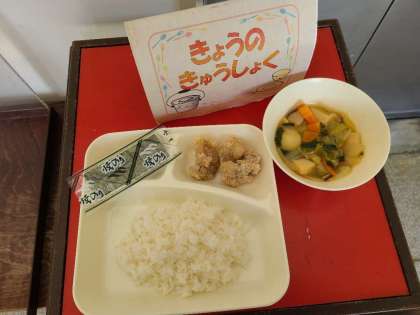 今日の給食は、鶏肉のからあげ、まる天と野菜のうま煮、焼きのり、ごはん、牛乳です。いただきます。