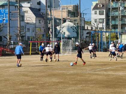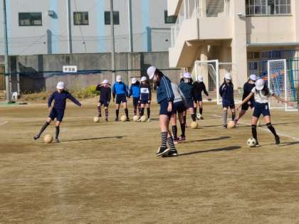 6年2組の体育の様子です。ゴール型のボール運動の様子です。ボールコントロールでは足の内側を上手く使っていました。
