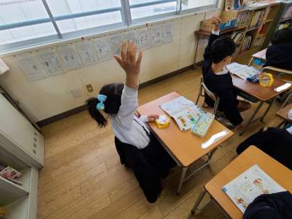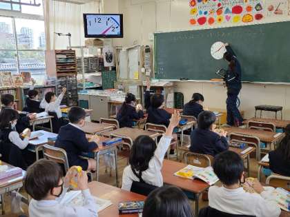 1年1組の算数の様子です。今日のめあては、「とけいをよんだり、はりをあわせたりしよう。」です。時計をさわりながら考えていました。