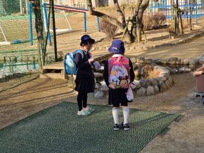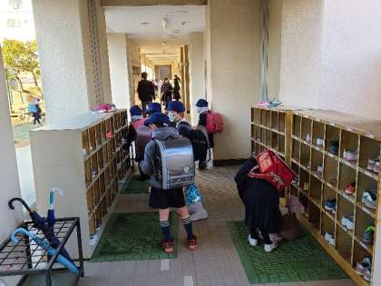 登校後すぐの様子です。来年度は新一年生が3クラスの予定です。下駄箱が一つ増えることになります。