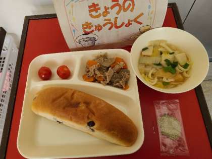 今日の給食は、豚肉とごぼうの煮もの、なにわうどん、プチトマト、パン、牛乳です。いただきます。