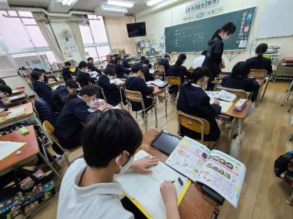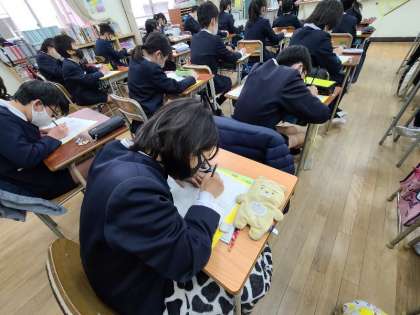 6年1組の家庭科の様子です。将来の自分の朝食を考えています。栄養バランスや消化によいもの、体があたたまるものなどです。体によくて美味しいな朝食ができるといいですね。