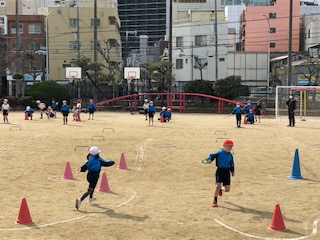 下段は、1年生の体育。障がい物のあるリレー遊びを楽しんでいました。