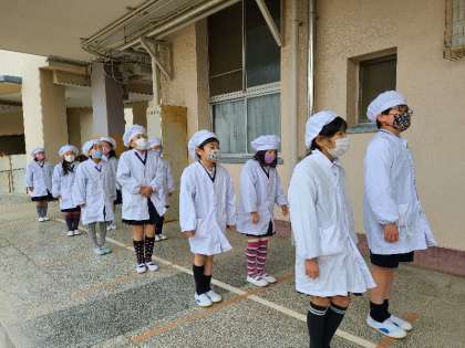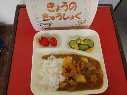 今日の給食は、ポークカレーライス、きゅうりとコーンのサラダ、いちご、牛乳です。いただきます。