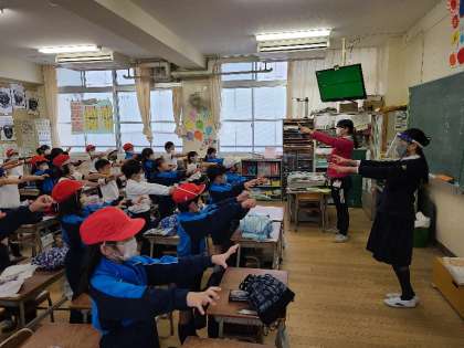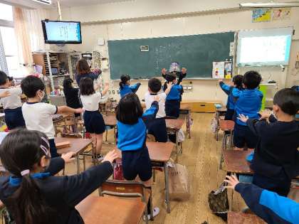 本日、各教室で体育朝会を行いました。肥後手まり歌の「あんたがたどこさ」の歌詞とリズムに合わせて、グーパー・グーパーを繰り返し握力を鍛えます。運動委員の児童が各教室に行きリードしました。