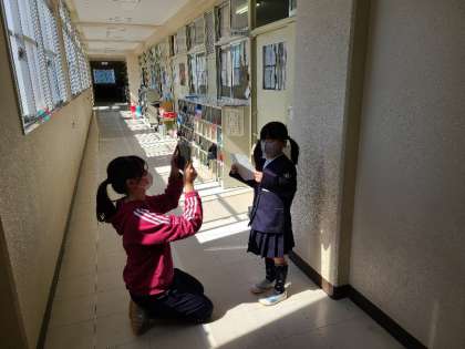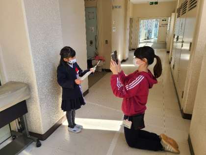 1年1組のせいかつかの様子です。新1年生を迎えて行う歓迎会で、学校の様子を説明する動画を撮影していました。早く新1年生が入学してこないかな。