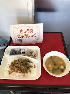 今日の給食は、鶏ごぼうご飯、、みそ汁、焼きれんこん、牛乳です。いただきます。