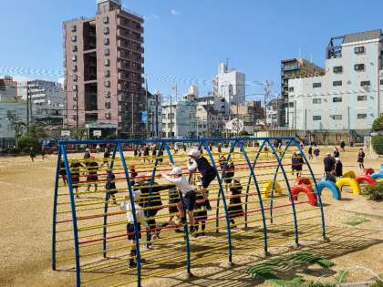 「行ってきます」と、今日も元気に運動場で遊んでいます。
