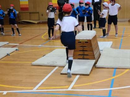 ICTを効果的に活用して、自分やお友だちの演技を確認し、自己の能力に適した課題を見つけるとともに、課題解決のための工夫を友だちと考える場面が見られました。