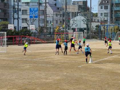 写真上:3年1組の体育の様子です。ゴール型ゲームをしています。ハンドボールを基にした易しいゲームです。パスをだす児童が、「もっと動いて」など互いに声をかけあいゲームを進めていました。