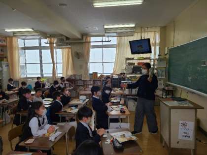 写真下:3年2組の英語の様子です。C-NETのルース先生の絵本の読み聞かせです。もちろん英語です。