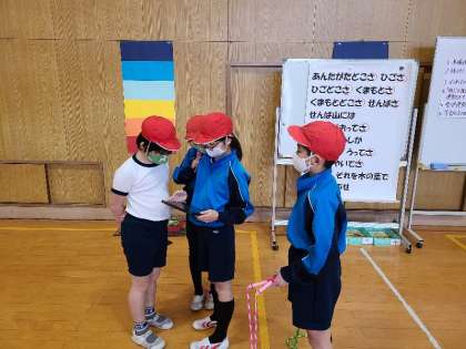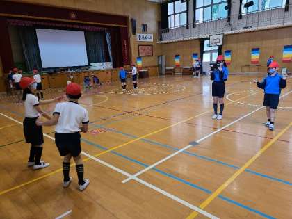 写真上:4年1組の体育の様子です。体つくり運動の用具を操作する運動です。2人交ごとびをしていました。
