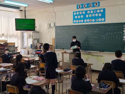 写真下:4年2組の算数の様子です。直方体や立方体の特徴やちがいを具体物を使って考えていました。