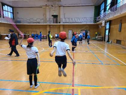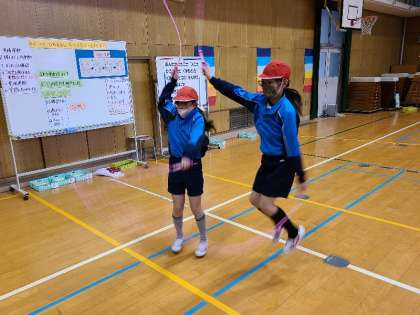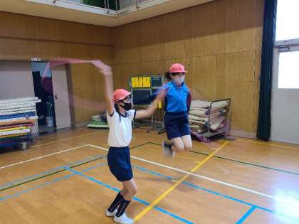 本日5時間目、4年2組が体育の授業研究を行いました。体つくり運動の用具を操作する運動です。なわとびで、二人交ごとびに挑戦しました。練習タイム、教え合いタイム、チャレンジタイムと、前回より1回でも多くとべることを目標に頑張りました。