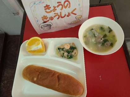 今日の給食は、えびと野菜のいためもの、中華がゆ、はっさく、パン、牛乳です。いただきます。